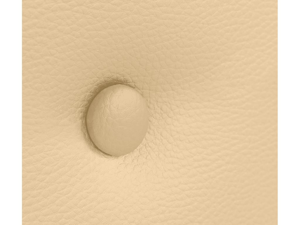 Combination of beige faux leather and solid wood base delivers a cozy and earthy vibe